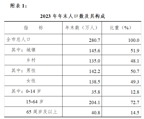 年末全市常住人口280.7萬人,比上年末減少2.8萬人。其中,城鎮(zhèn)人口145.6萬人,鄉(xiāng)村人口135.0萬人;常住人口城鎮(zhèn)化率為51.9%,比上年提高0.9個百分點。男性人口142.2萬人,女性人口138.5萬人。全年出生人口1.4萬人,出生率為4.98‰;死亡人口2.7萬人,死亡率為9.61‰;人口自然增長率為-4.64‰。