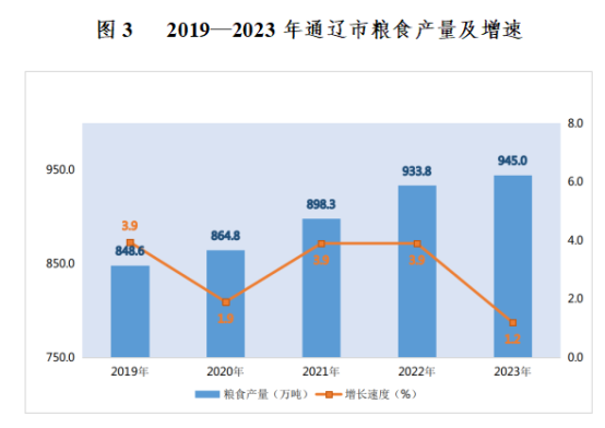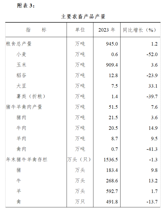 全年糧食作物播種面積126.2萬公頃,比上年增加0.3萬公頃,增長0.2%。其中,玉米播種面積116.6萬公頃,比上年增加3.8萬公頃,增長3.4%;稻谷播種面積1.6萬公頃,比上年減少0.5萬公頃,下降25.3%;小麥播種面積0.1萬公頃,比上年減少0.1萬公頃,下降49.5%;高粱播種面積1.0萬公頃,比上年減少1.1萬公頃,下降52.2%;蕎麥播種面積0.1萬公頃,比上年減少0.2萬公頃,下降57.3%;大豆播種面積4.3萬公頃,比上年增加1.5萬公頃,增長51.2%。