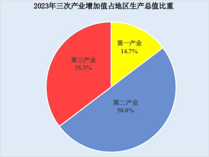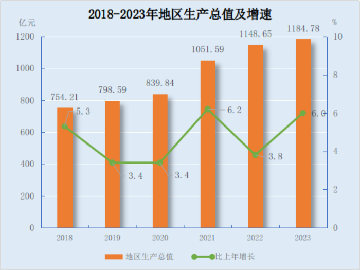 根據(jù)盟市生產(chǎn)總值統(tǒng)一核算結(jié)果,2023年全盟地區(qū)生產(chǎn)總值為1184.78億元,比上年增長6.0%。其中,第一產(chǎn)業(yè)增加值為174.30億元,增長6.6%;第二產(chǎn)業(yè)增加值為592.26億元,增長4.8%;第三產(chǎn)業(yè)增加值為418.22億元,增長6.9%。三次產(chǎn)業(yè)比例為14.7:50.0:35.3。第一、二、三產(chǎn)業(yè)對生產(chǎn)總值增長的貢獻率分別為17.9%、34.8%和47.3%。人均生產(chǎn)總值達到105784元,比上年增長6.0%。