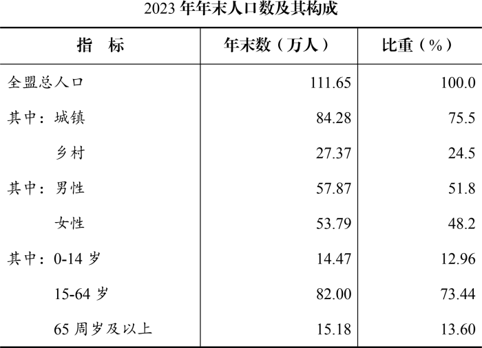 年末全盟常住人口111.65萬人,比上年末減少0.28萬人。其中,城鎮(zhèn)人口84.28萬人,鄉(xiāng)村人口27.37萬人;常住人口城鎮(zhèn)化率達到75.48%,比上年末提高?0.85個百分點。男性人口?57.87萬人,女性人口53.79萬人。全年出生人口0.53萬人,出生率為4.71‰;死亡人口0.82萬人,死亡率為7.30‰;人口自然增長率為-2.59‰。