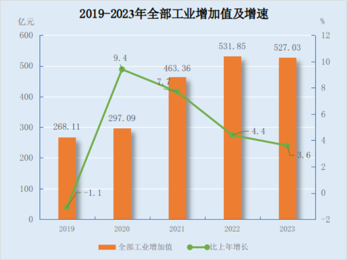 全年全部工業(yè)增加值比上年增長3.6%。其中,規(guī)模以上工業(yè)增加值增長4.6%。在規(guī)模以上工業(yè)中,分經(jīng)濟類型看,國有控股企業(yè)增加值增長0.9%股份制企業(yè)增長3.2%,外商及港澳臺商投資企業(yè)增長32.7%。分門類看,采礦業(yè)增長0.3%,制造業(yè)增長17.5%,電力、熱力、燃氣及水生產(chǎn)和供應(yīng)業(yè)增長12.0%。分重點行業(yè)看,冶金工業(yè)增長34.1%,農(nóng)畜產(chǎn)品加工業(yè)增長7.2%,能源工業(yè)增長1.1%,化工行業(yè)下降3.2%,裝備制造業(yè)下降28.6%。