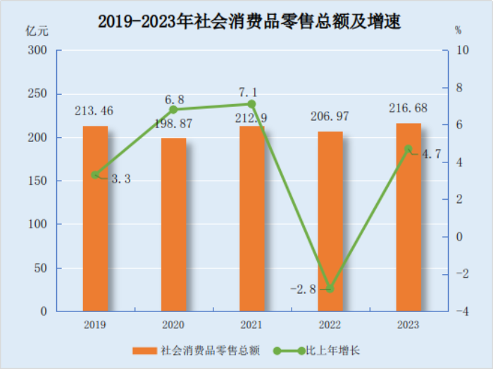 全年社會消費品零售總額216.68億元,比上年增長4.7%。按經(jīng)營地統(tǒng)計,城鎮(zhèn)消費品零售額189.01億元,增長4.6%;農(nóng)村牧區(qū)消費品零售額27.67億元,增長5.6%。按消費類型統(tǒng)計,商品零售額188.14億元,增長3.4%;餐飲收入28.54億元,增長14.5%。