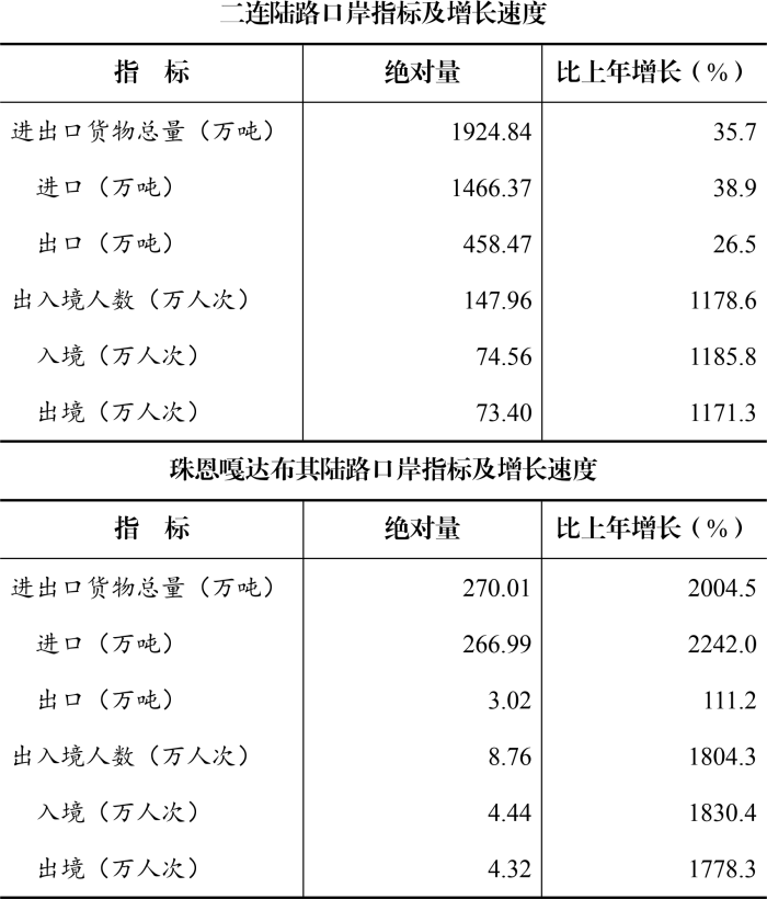 全年進出口總額115.57億元,比上年增長62.7%。其中,進口總額79.08億元,增長89.5%;出口總額36.49億元,增長24.6%。口岸進出口貨物量2194.85萬噸,比上年增長53.4%。其中,二連口岸1924.84萬噸,增長35.7%;珠恩嘎達布其口岸270.01萬噸,增長20倍。出入境人員156.72萬人次,比上年增長12倍。其中,二連口岸147.96萬人次,增長12倍;珠恩嘎達布其口岸8.76萬人次,增長18倍。