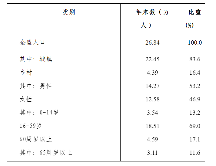 年末全盟常住人口26.84萬人,比上年末減少0.06萬人。常住人口城鎮(zhèn)化率達(dá)83.63%,比上年末提高0.91個百分點(diǎn)。全年出生人口0.15萬人,出生率為5.40‰;人口死亡率為6.79‰;人口自然增長率為-1.39‰。