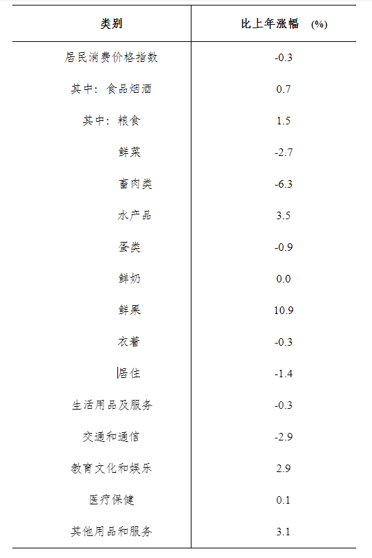 全年居民消費(fèi)價格比上年下降0.3%。分類別看,食品煙酒類上漲0.7%、衣著類下降0.3%、居住類下降1.4%、生活用品及服務(wù)類下降0.3%、交通通信類下降2.9%、教育文化和娛樂類上漲2.9%、醫(yī)療保健類上漲0.1%、其他用品和服務(wù)類上漲3.1%。