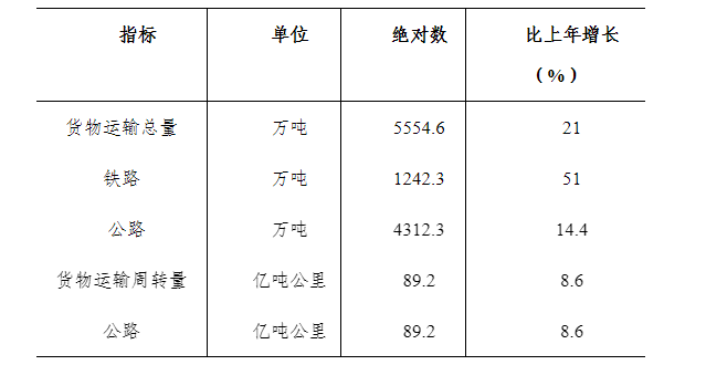 全年完成貨物運(yùn)輸總量5554.6萬噸,比上年增長21%。完成貨物運(yùn)輸周轉(zhuǎn)量89.2億噸公里,比上年增長8.6%。