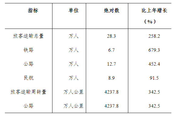 全年完成旅客運(yùn)輸總量28.3萬人,比上年增長258.2%。完成旅客運(yùn)輸周轉(zhuǎn)量4237.8萬人公里,比上年增長342.5%。