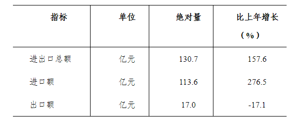 全年海關(guān)進(jìn)出口總額130.7億元(人民幣,下同),比上年增長157.6%,其中:進(jìn)口額113.6億元,增長276.5%;出口額17.0億元,下降17.1%。