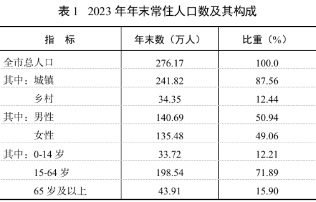 全市年末常住人口276.17萬(wàn)人,比上年末增加2.13萬(wàn)人。其中,城鎮(zhèn)人口241.82萬(wàn)人,鄉(xiāng)村人口34.35萬(wàn)人;常住人口城鎮(zhèn)化率為87.56%,比上年末提高0.68個(gè)百分點(diǎn)。男性人口140.69萬(wàn)人,女性人口135.48萬(wàn)人。全年出生人口1.38萬(wàn)人,出生率為5.03‰;死亡人口2.17萬(wàn)人,死亡率為7.90‰。