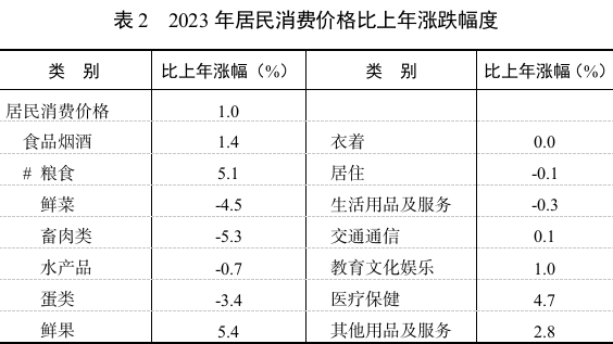 全年居民消費(fèi)價(jià)格比上年上漲1.0%。分類(lèi)別看,醫(yī)療保健類(lèi)價(jià)格上漲4.7%,食品煙酒類(lèi)價(jià)格上漲1.4%,教育文化娛樂(lè)類(lèi)價(jià)格上漲1.0%,交通通信類(lèi)價(jià)格上漲0.1%,居住類(lèi)價(jià)格[3]下降0.1%。