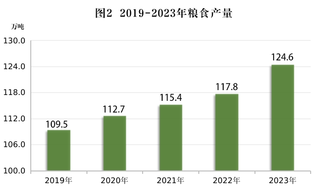 全年糧食總產(chǎn)量124.6萬(wàn)噸,比上年增長(zhǎng)5.7%。其中,玉米產(chǎn)量118.2萬(wàn)噸,比上年增加9.1萬(wàn)噸;小麥產(chǎn)量1.3萬(wàn)噸,減少0.6萬(wàn)噸;燕麥產(chǎn)量0.1萬(wàn)噸,減少0.01萬(wàn)噸;高粱產(chǎn)量0.8萬(wàn)噸,減少0.2萬(wàn)噸;蕎麥產(chǎn)量0.6萬(wàn)噸,減少0.5萬(wàn)噸;馬鈴薯折糧產(chǎn)量2.1萬(wàn)噸,減少0.4萬(wàn)噸。