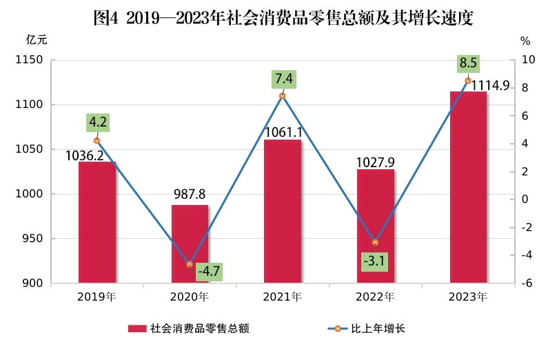 全年社會(huì)消費(fèi)品零售總額1114.9億元,比上年增長(zhǎng)8.5%。按經(jīng)營(yíng)地統(tǒng)計(jì),城鎮(zhèn)消費(fèi)品零售額1063.4億元,增長(zhǎng)8.5%;鄉(xiāng)村消費(fèi)品零售額51.5億元,增長(zhǎng)8.3%。按消費(fèi)類(lèi)型統(tǒng)計(jì),商品零售額968.7億元,增長(zhǎng)8.2%;餐飲收入146.1億元,增長(zhǎng)10.1%。