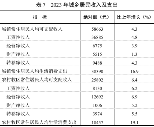 全年全體居民人均可支配收入54375元,比上年增長(zhǎng)4.5%。按常住地分,城鎮(zhèn)常住居民人均可支配收入58663元,增長(zhǎng)4.3%;農(nóng)村牧區(qū)常住居民人均可支配收入25802元,增長(zhǎng)6.4%。