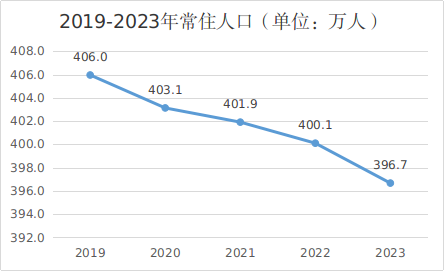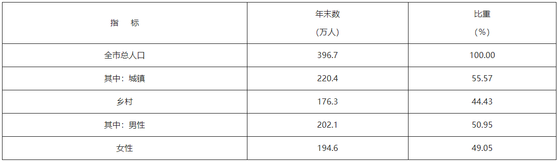 年末全市常住人口396.7萬人,比上年末減少3.4萬人。其中,城鎮(zhèn)人口220.4萬人,鄉(xiāng)村人口176.3萬人;常住人口城鎮(zhèn)化率達(dá)55.57%,比上年增長0.94個百分點。男性人口202.1萬人,女性人口194.6萬人。全年出生人口2萬人,出生率5‰;死亡人口3.3萬人,死亡率為8.3‰。