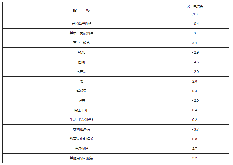 全年居民消費價格比上年下降0.4%。分類別看,醫(yī)療保健價格上漲2.7%,其他用品及服務(wù)價格上漲2.2%,教育文化娛樂價格上漲0.8%,居住價格上漲0.4%,生活用品及服務(wù)價格上漲0.2%,食品煙酒價格與上年持平,衣著價格下降2.0%,交通通信價格下降3.7%。全年工業(yè)生產(chǎn)者出廠價格比上年下降7.9%。