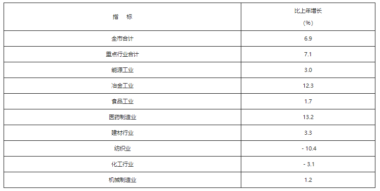 全年全部工業(yè)增加值比上年增長7.1%。其中,規(guī)模以上工業(yè)增加值增長6.9%。在規(guī)模以上工業(yè)中,分經(jīng)濟類型看,國有企業(yè)增長17.0%,國有控股企業(yè)增長4.4%,股份制企業(yè)增長6.8%,外商及港澳臺投資企業(yè)下降11.4%。分門類看,采礦業(yè)下降5.9%,制造業(yè)增長12.0%,電力、熱力、燃?xì)饧八a(chǎn)和供應(yīng)業(yè)增長7.1%。分輕重工業(yè)看,輕工業(yè)增長4.2%,重工業(yè)增長7.2%。分重點行業(yè)看,能源工業(yè)增長3.0%,冶金工業(yè)增長12.3%,食品工業(yè)增長1.7%,化工行業(yè)下降3.1%。