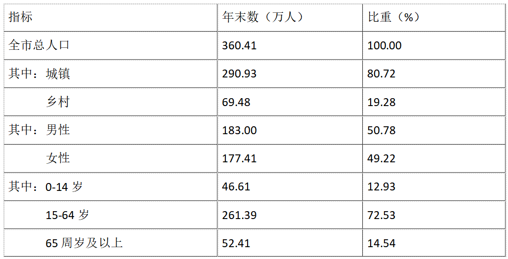 年末全市常住人口360.41萬人,比上年末增加5.30萬人。其中,城鎮(zhèn)人口290.93萬人,鄉(xiāng)村人口69.48萬人;常住人口城鎮(zhèn)化率達80.7%,比上年提高0.9個百分點。男性人口183.00萬人,女性人口177.41萬人。全年出生人口2.00萬人,出生率為5.58‰;死亡人口2.27萬人,死亡率為6.34‰;人口自然增長率為-0.76‰。