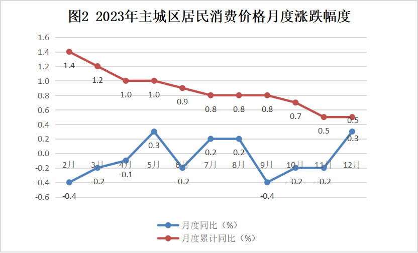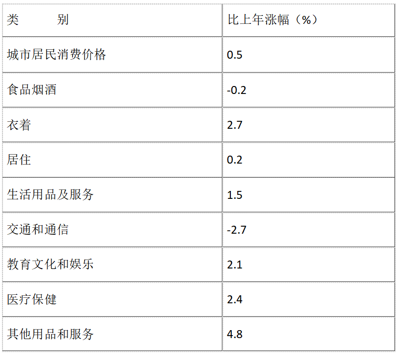 全年全市主城區(qū)居民消費價格比上年上漲0.5%。分類別看,交通通信類下降2.7%,食品煙酒類下降0.2%,教育文化娛樂類上漲2.1%,生活用品及服務(wù)類上漲1.5%,其他用品及服務(wù)類上漲4.8%,衣著類上漲2.7%,醫(yī)療保健類上漲2.4%,居住類上漲0.2%。