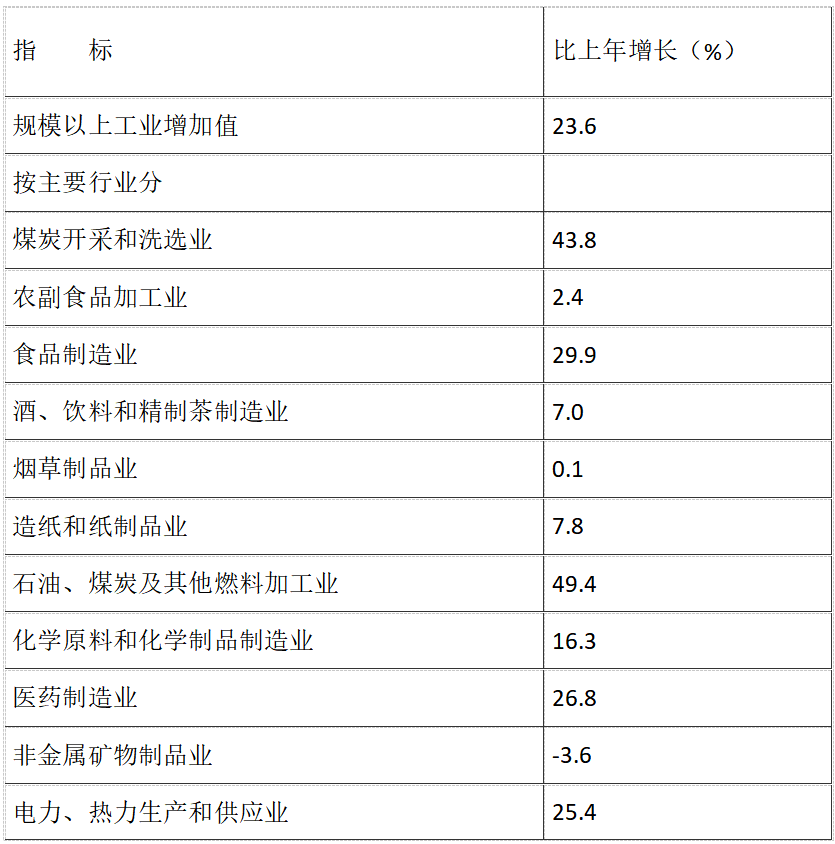 全年全部工業(yè)增加值比上年增長16.1%。其中,規(guī)模以上工業(yè)增加值增長23.6%。在規(guī)模以上工業(yè)中,分門類看,采礦業(yè)增加值增長34.4%,制造業(yè)增長19.8%,電力、熱力、燃氣及水生產(chǎn)和供應(yīng)業(yè)增長39.6%。分經(jīng)濟類型看,國有控股企業(yè)增加值增長22.6%,股份制企業(yè)增長19.7%,外商及港澳臺商投資企業(yè)增長38.9%,私營企業(yè)增長12.9%。分行業(yè)看,食品制造業(yè)增加值增長29.9%,煙草制品業(yè)增長0.1%,造紙和紙制品業(yè)增長7.8%,石油、煤炭及其他燃料加工業(yè)增長49.4%,化學(xué)原料和化學(xué)制品制造業(yè)增長16.3%,醫(yī)藥制造業(yè)增長26.8%,非金屬礦物制品業(yè)下降3.6%,電力、熱力生產(chǎn)和供應(yīng)業(yè)增長25.4%。