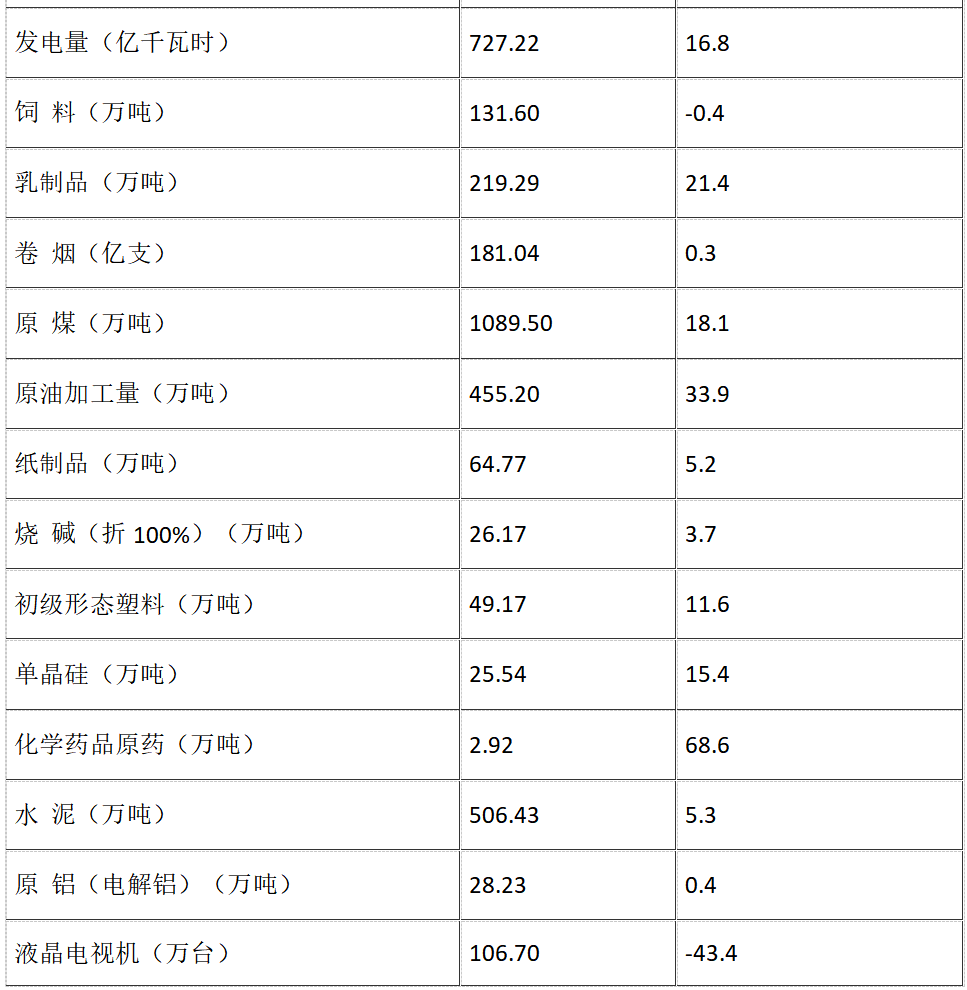 從主要工業(yè)產(chǎn)品產(chǎn)量看,發(fā)電量727.22億千瓦時,比上年增長16.8%;飼料131.60萬噸,下降0.4%;乳制品219.29萬噸,增長21.4%;卷煙181.04億支,增長0.3%;原油加工量455.20萬噸,增長33.9%;燒堿(折純)26.17萬噸,增長3.7%;水泥506.43萬噸,增長5.3%;單晶硅25.54萬噸,增長15.4%;原鋁(電解鋁)28.23萬噸,增長0.4%。