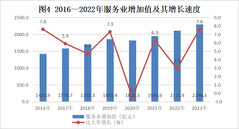全年批發(fā)和零售業(yè)增加值245.13億元,比上年增長6.5%;交通運輸、倉儲和郵政業(yè)增加值208.35億元,增長12.6%;住宿和餐飲業(yè)增加值90.42億元,增長24.1%;金融業(yè)增加值303.43億元,增長8.7%;房地產(chǎn)業(yè)增加值230.13億元,增長4.1%;其他服務(wù)業(yè)增加值1214.98億元,增長6.4%,其中,信息傳輸、軟件和信息技術(shù)服務(wù)業(yè)增加值158.90億元,增長16.2%;租賃和商務(wù)服務(wù)業(yè)增加值61.53億元,增長7.7%。全年規(guī)模以上服務(wù)業(yè)企業(yè)營業(yè)收入1059.84億元,增長12.1%。