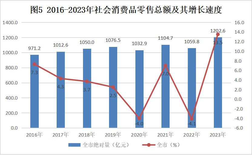 全年社會消費品零售總額1202.59億元,比上年增長13.5%。按經(jīng)營地統(tǒng)計,城鎮(zhèn)消費品零售額1070.55億元,增長13.4%;鄉(xiāng)村消費品零售額132.04億元,增長14.3%。按消費類型統(tǒng)計,商品零售額1051.88億元,增長12.8%;餐飲收入150.70億元,增長18.5%。