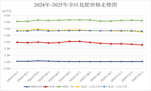 ?1月份,供應(yīng)方面,氣頭裝置繼續(xù)恢復(fù),尿素供應(yīng)水平持續(xù)提升,行業(yè)供應(yīng)壓力逐漸顯現(xiàn);需求方面,農(nóng)需淡季,工業(yè)需求以剛需采購為主,隨著春節(jié)假期臨近,市場活躍度逐漸降低,肥市行情以弱勢波動(dòng)下行運(yùn)行為主。具體來看,碳酸氫銨、尿素、磷酸二銨、氯基三元復(fù)合肥、硫基三元復(fù)合肥(均為國產(chǎn),下同)1月份全區(qū)月度平均價(jià)格分別為每千克1.03元、2.29元、4.11元、3.26元、3.32元;與2024年12月相比(下稱環(huán)比),碳酸氫銨價(jià)格略升0.32%,尿素、磷酸二銨、硫基三元復(fù)合肥、氯基三元復(fù)合肥價(jià)格分別小幅下降2.00%、0.88%、1.71%、1.00%;與2024年1月相比(下稱同比),磷酸二銨價(jià)格上漲1.31%,碳酸氫銨、尿素、硫基三元復(fù)合肥、氯基三元復(fù)合肥價(jià)格分別下降1.59%、7.80%、3.45%、0.40%。