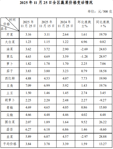 11月25日,全區(qū)蔬菜綜合平均零售價格為3.84元/500克,環(huán)比上漲1.59%。本旬監(jiān)測的15種蔬菜品種價格12漲3降,上漲幅度居前的品種為圓白菜、西紅柿、大白菜、,分別上漲9.52%、7.73%、6.96%。與去年同期相比,15個蔬菜品種綜合平均零售價格上漲13.27%。?????