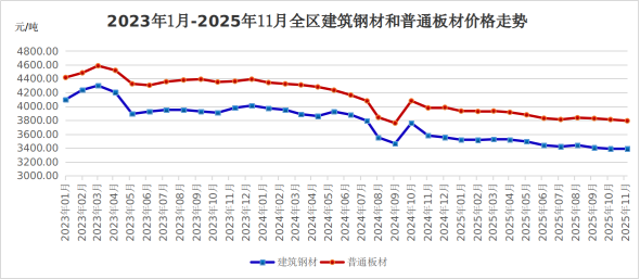 11月份,建筑鋼材、普通板材全區(qū)綜合平均價(jià)格分別為每噸3389.44元、3792.31元。與2025年10月相比(下稱環(huán)比),建筑鋼材價(jià)格略漲0.04%,普通板材價(jià)格略降0.48%;與2024年11月相比(下稱同比),建筑鋼材、普通板材價(jià)格分別下降5.30%、4.68%。