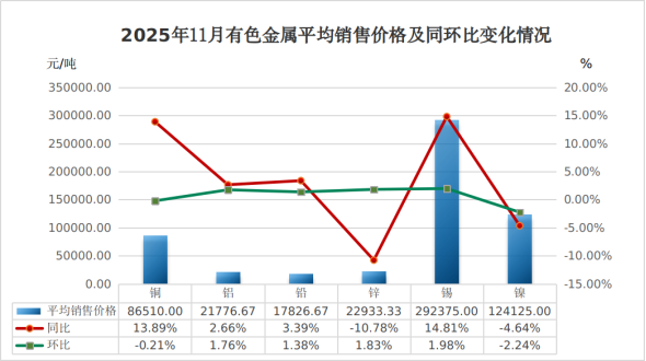 鋅(0# 鋅錠)、錫(1# 錫錠)、鎳(1#)11月平均銷售價(jià)格分別為每噸22933.33元、292375.00元、124125.00元。環(huán)比,鋅、錫價(jià)格分別小幅上漲1.83%、1.98%,鎳價(jià)格小幅下降2.24%;同比,錫價(jià)格上漲14.81%,鋅、鎳價(jià)格分別下降10.78%、4.64%。