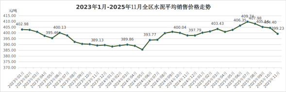 11月份,三種硅酸鹽水泥全區(qū)平均銷售價(jià)格為399.23元/噸,環(huán)比價(jià)格下降1.28%,同比價(jià)格略漲0.35%。