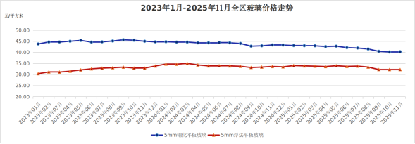 5mm浮法平板玻璃、5mm鋼化平板玻璃11月份平均價(jià)格分別為每平方米32.21元、40.25元。環(huán)比,5mm浮法平板玻璃持平,5mm鋼化平板玻璃價(jià)格略漲0.27%;同比分別下降4.21%、7.07%。