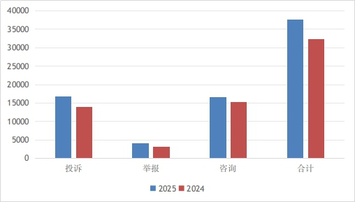 2025年11月份,內(nèi)蒙古全國(guó)12315平臺(tái)共接收消費(fèi)者投訴、舉報(bào)、咨詢37596件,同比增長(zhǎng)16.26%。其中,投訴16887件,占總量的44.92%;舉報(bào)4120件,占總量的10.96%;咨詢16589件,占總量的44.12%。