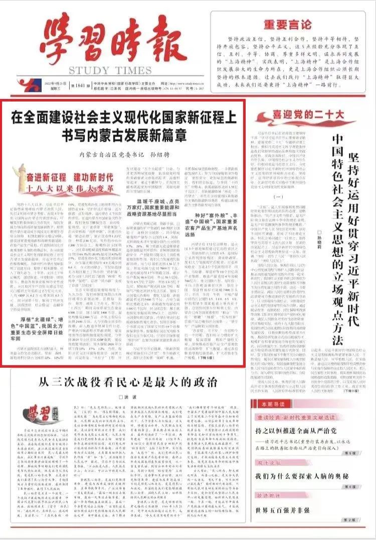 9月21日,由中共中央黨校(國家行政學(xué)院)主管主辦的《學(xué)習(xí)時(shí)報(bào)》在頭版頭條刊發(fā)內(nèi)蒙古自治區(qū)黨委書記孫紹騁署名文章《在全面建設(shè)社會(huì)主義現(xiàn)代化國家新征程上書寫內(nèi)蒙古發(fā)展新篇章》。