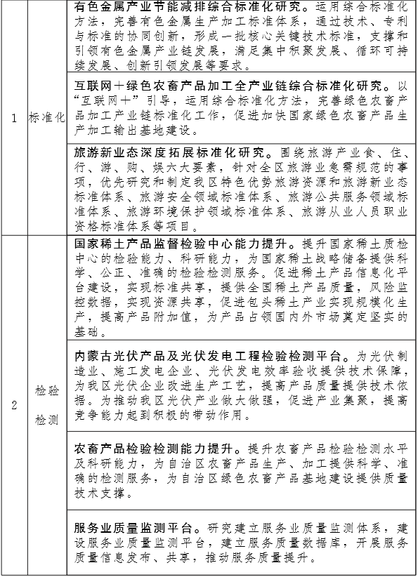 加強(qiáng)政策支持和引導(dǎo),發(fā)揮企業(yè)技術(shù)創(chuàng)新主體作用,健全產(chǎn)學(xué)研用相結(jié)合的質(zhì)量技術(shù)創(chuàng)新機(jī)制,在現(xiàn)代煤化工、農(nóng)畜產(chǎn)品加工、裝備制造、有色金屬生產(chǎn)加工等行業(yè)打造一批掌握核心技術(shù)、引領(lǐng)行業(yè)發(fā)展的創(chuàng)新型企業(yè),培育一批具有自主知識(shí)產(chǎn)權(quán)的科技型企業(yè)。鼓勵(lì)和扶持規(guī)模以上企業(yè)建立技術(shù)研究中心和重點(diǎn)實(shí)驗(yàn)室,組織實(shí)施重大科技專項(xiàng),開展重大技術(shù)攻關(guān),突破一批核心、關(guān)鍵和共性技術(shù),形成一批技術(shù)標(biāo)準(zhǔn),轉(zhuǎn)化一批科技成果。將質(zhì)量創(chuàng)新作為轉(zhuǎn)方式、調(diào)結(jié)構(gòu)、提質(zhì)增效的重要手段,突出科技與產(chǎn)業(yè)融合,推動(dòng)蒙東、蒙西清潔能源、現(xiàn)代煤化工產(chǎn)業(yè) 集聚區(qū)建設(shè),加快建設(shè)一批奶牛、肉牛、肉羊、絨山羊產(chǎn)業(yè)集聚區(qū),以科技創(chuàng)新、技術(shù)創(chuàng)新推動(dòng)產(chǎn)品質(zhì)量升級(jí),促使我區(qū)優(yōu)勢(shì)產(chǎn) 業(yè)達(dá)到國內(nèi)先進(jìn)水平,煤化工、乳肉制品產(chǎn)業(yè)達(dá)到世界先進(jìn)水 平。推動(dòng)實(shí)施重大質(zhì)量改進(jìn)和技術(shù)改造項(xiàng)目,培育形成以技術(shù)、標(biāo)準(zhǔn)、品牌、服務(wù)為核心的質(zhì)量發(fā)展新優(yōu)勢(shì)。