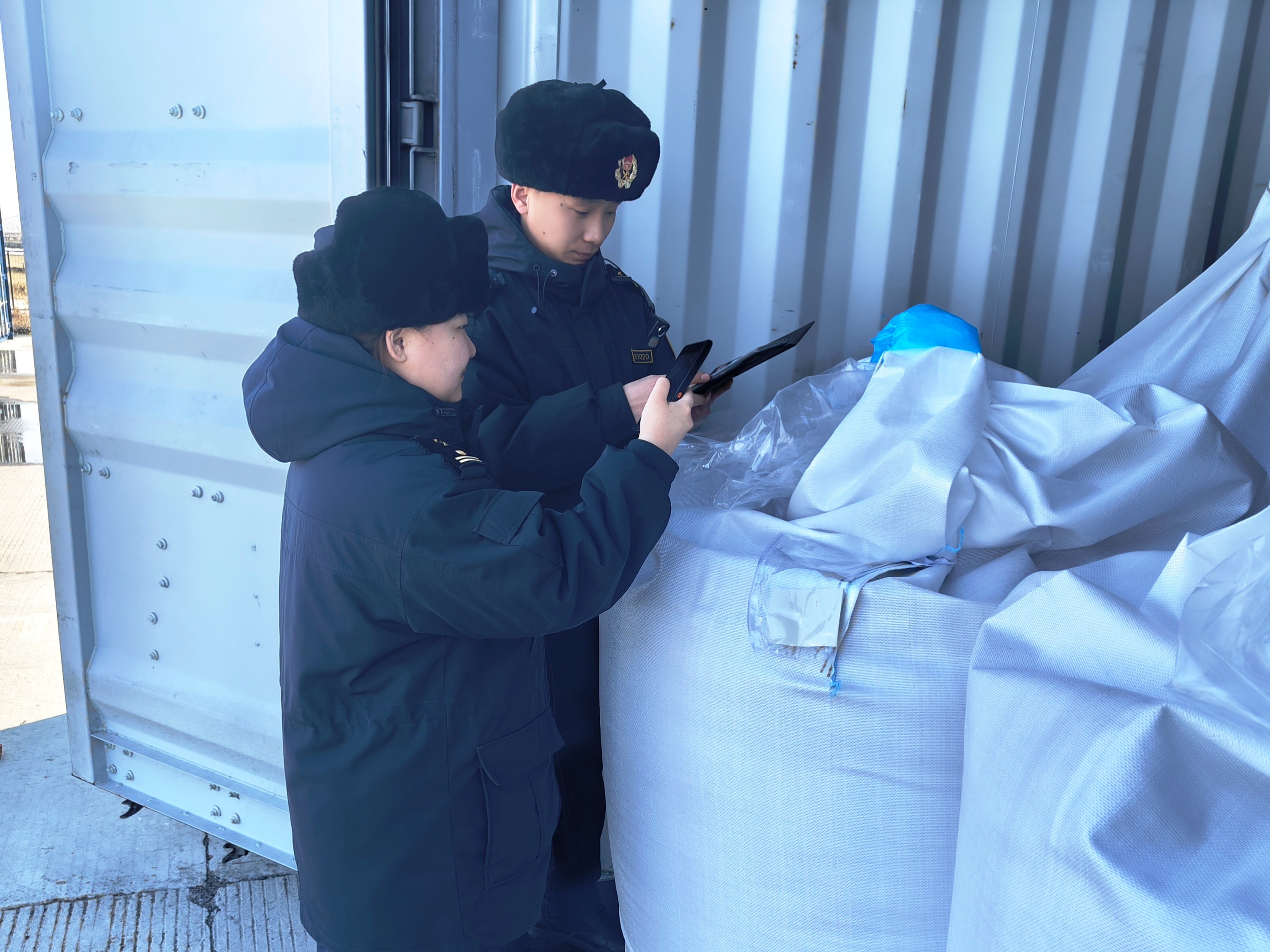 圖為滿洲里車站海關(guān)關(guān)員對(duì)進(jìn)口化肥進(jìn)行監(jiān)管作業(yè)。 通訊員 馬文玉 攝