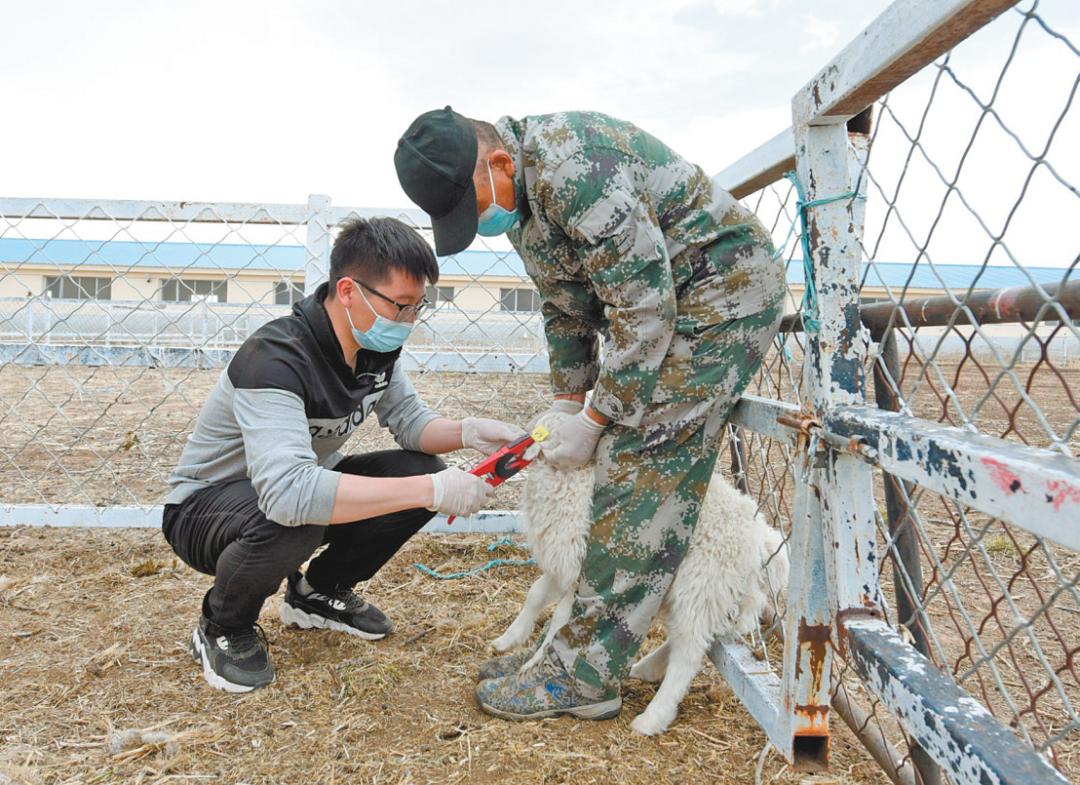 在為優(yōu)質(zhì)羔羊打成長(zhǎng)全過(guò)程記錄耳標(biāo)。