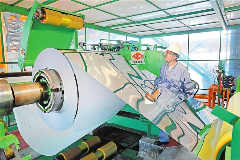 甘肅甬金金屬科技公司工人檢查剛軋成的不銹鋼板帶成品。嘉峪關市大力優(yōu)化營商環(huán)境,精準招商,引進浙江甬金科技集團股份公司投資建立延鏈企業(yè)。(記者田蹊)