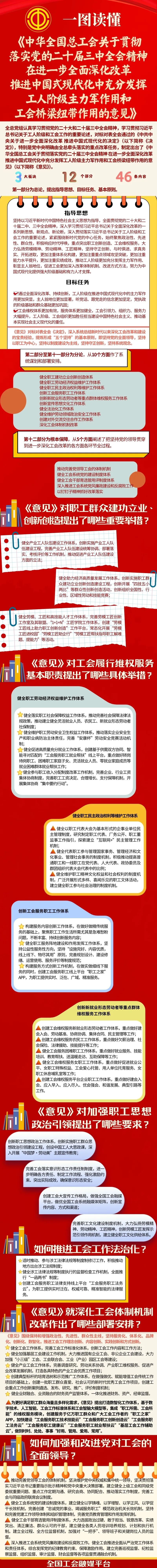 近日,《中華全國總工會關(guān)于貫徹落實(shí)黨的二十屆三中全會精神 在進(jìn)一步全面深化改革推進(jìn)中國式現(xiàn)代化中充分發(fā)揮工人階級主力軍作用和工會橋梁紐帶作用的意見》(以下簡稱《意見》)正式印發(fā)?!兑庖姟穼Τ浞职l(fā)揮工人階級主力軍作用、充分發(fā)揮工會橋梁紐帶作用提出了哪些具體舉措,一圖讀懂!