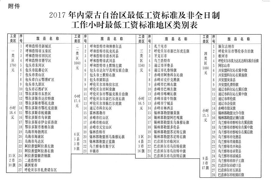 附件:2017年內(nèi)蒙古自治區(qū)最低工資標(biāo)準(zhǔn)及非全日制工作小時(shí)最低工資標(biāo)準(zhǔn)地區(qū)類別表