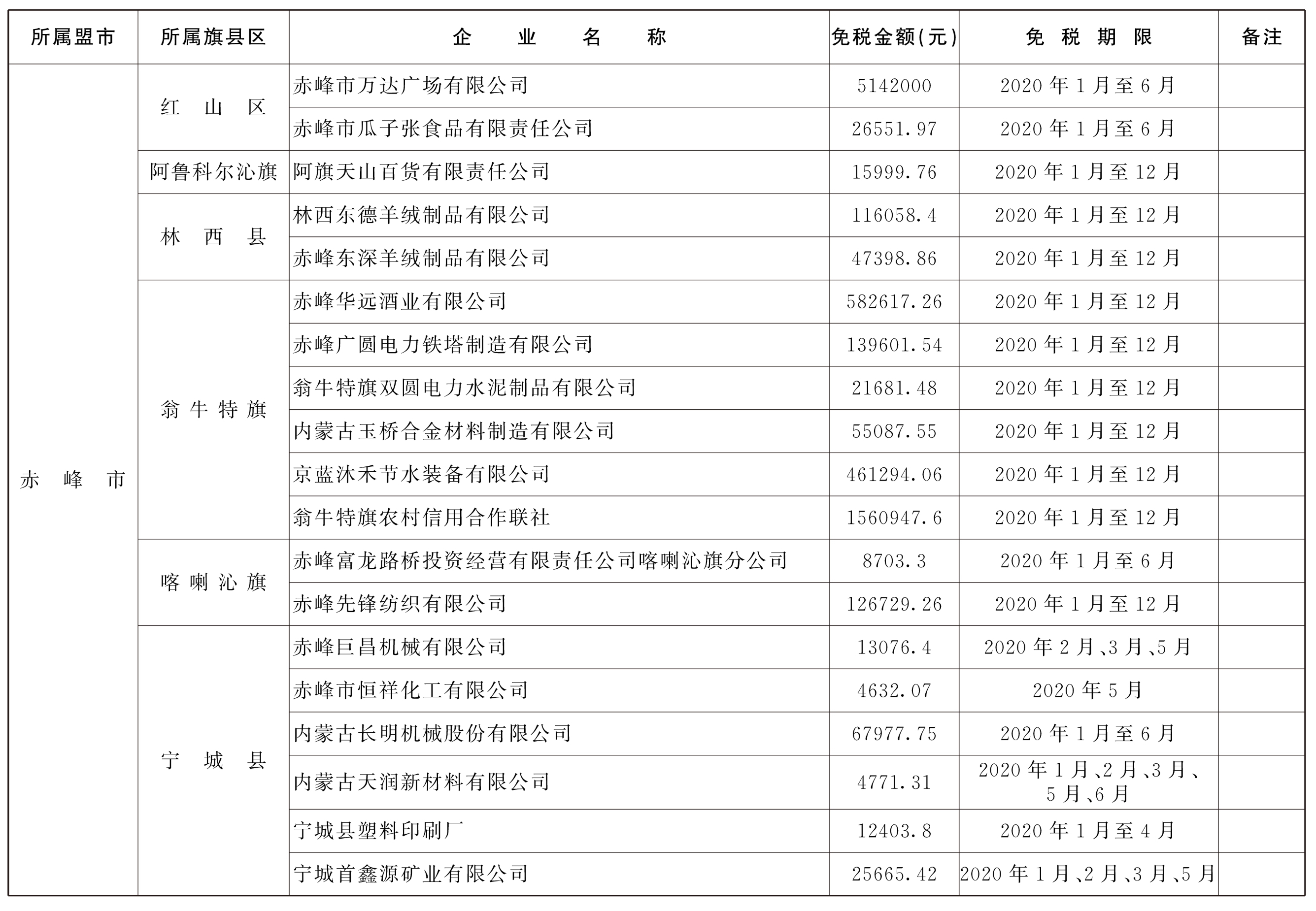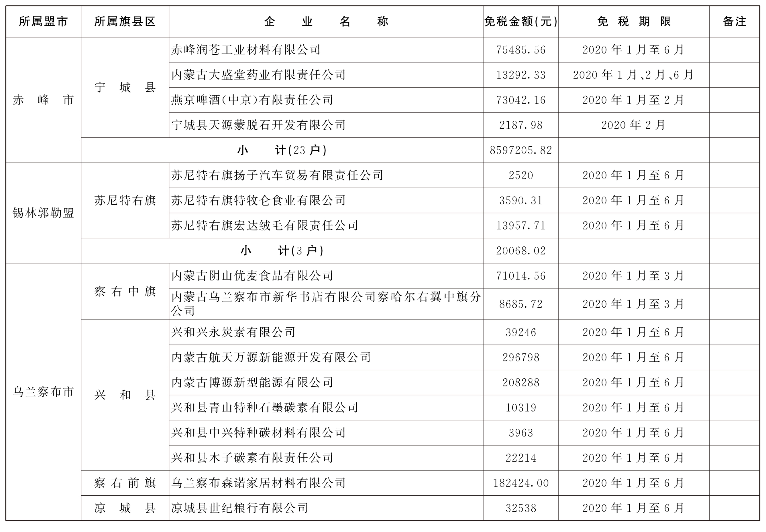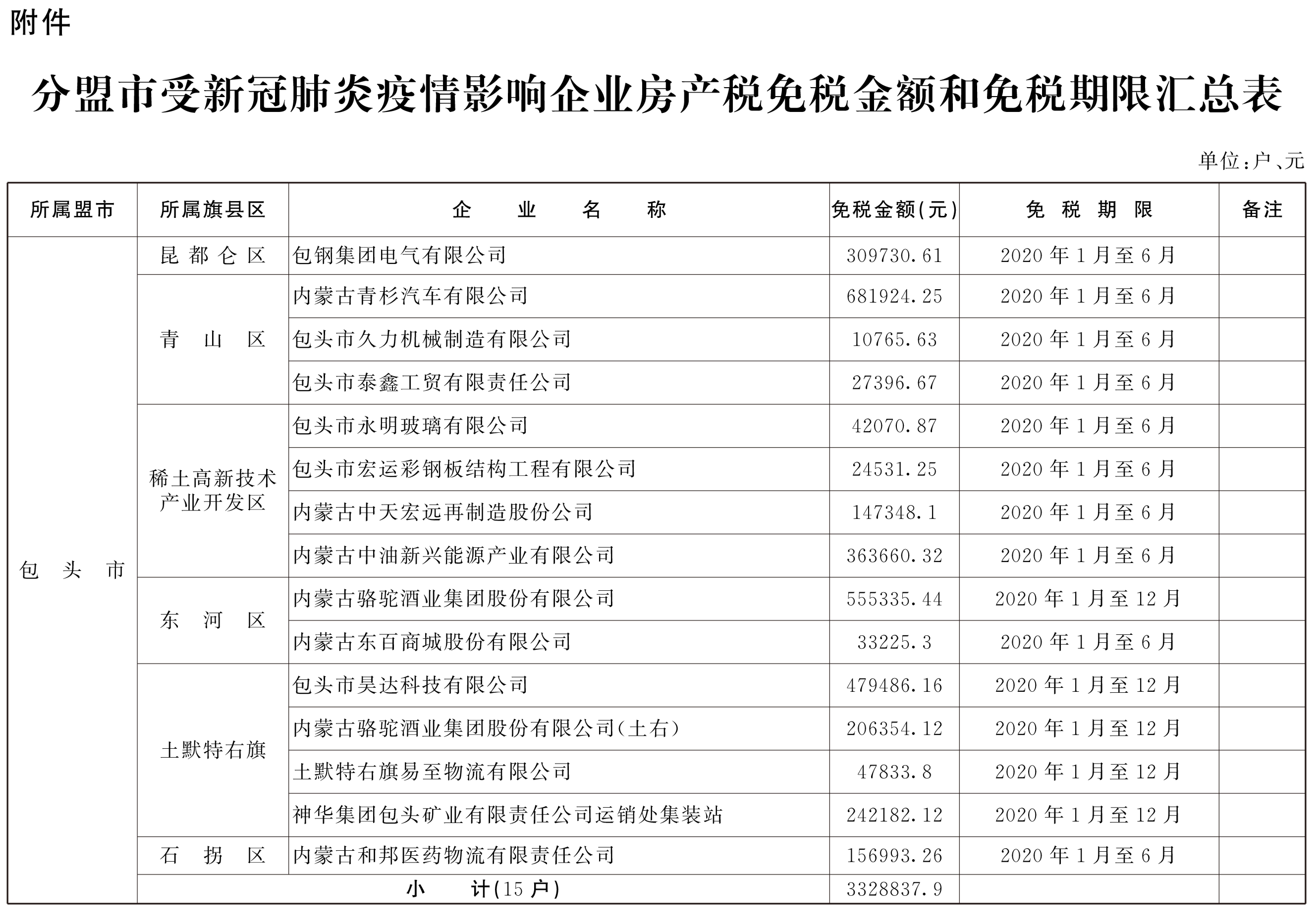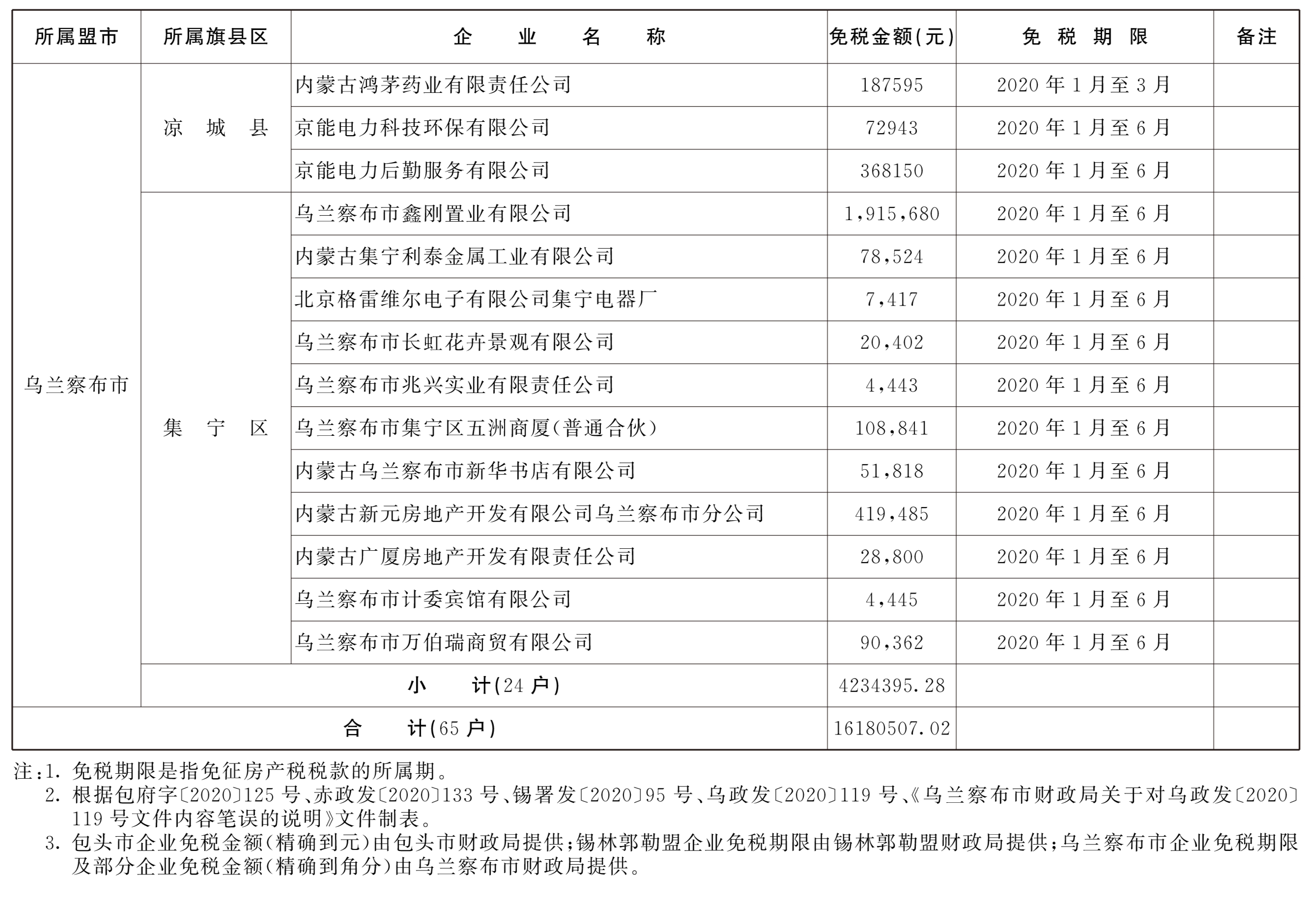 一、同意免征包頭市、赤峰市、錫林郭勒盟、烏蘭察布市65戶受新冠肺炎疫情影響企業(yè)應(yīng)納房產(chǎn)稅合計16180507.02元。其中,包頭市15戶,免稅3328837.9元;赤峰市23戶,免稅8597205.82元;錫林郭勒盟3戶,免稅20068.02元;烏蘭察布市24戶,免稅4234395.28元。具體免稅企業(yè)名稱、免稅金額和免稅期限見附件。