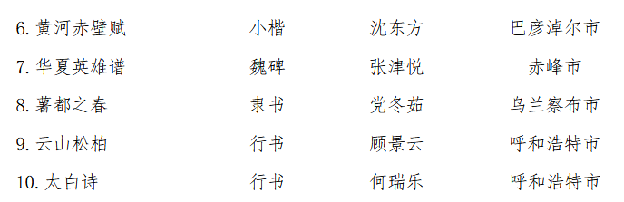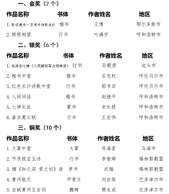為深入貫徹習近平新時代中國特色社會主義思想,落實“兩個打造”工作要求,弘揚中華優(yōu)秀傳統(tǒng)文化,展示近年來我區(qū)書法藝術(shù)成果,豐富群眾文化生活,6月28日-7月6日,由內(nèi)蒙古自治區(qū)文化和旅游廳主辦、內(nèi)蒙古自治區(qū)文化館承辦的2022年“醉美草原,亮麗北疆”第二屆全區(qū)書法作品展覽在呼和浩特市美術(shù)館展出。此次活動共收到來自我區(qū)各盟市文化館(群藝館)推薦的作品100余幅。經(jīng)評委會專家評選,有18個作品獲金、銀、銅獎,其中金獎2幅,銀獎6幅,銅獎10幅,現(xiàn)將獲獎名單公布如下: