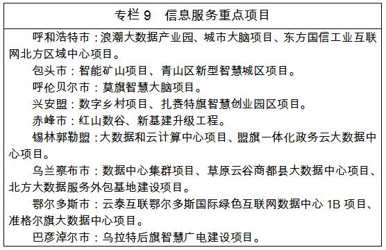 信息基礎(chǔ)設(shè)施。以提高網(wǎng)速、降低資費(fèi)為重點(diǎn),加快推進(jìn)5G網(wǎng)絡(luò)基站建設(shè),實(shí)現(xiàn)5G信號蘇木鄉(xiāng)鎮(zhèn)以上區(qū)域和重點(diǎn)工業(yè)園區(qū)全覆蓋。推進(jìn)骨干網(wǎng)、城域網(wǎng)和接入網(wǎng)升級改造,提升網(wǎng)絡(luò)容量和智能調(diào)度能力,推動公共服務(wù)場所等重點(diǎn)區(qū)域無線局域網(wǎng)覆蓋。建設(shè)呼和浩特國家級大數(shù)據(jù)產(chǎn)業(yè)發(fā)展核心區(qū)及包頭、赤峰、烏蘭察布、鄂爾多斯等自治區(qū)級大數(shù)據(jù)產(chǎn)業(yè)發(fā)展集聚區(qū),服務(wù)器裝機(jī)能力突破200萬臺,配套建設(shè)一批服務(wù)器制造、運(yùn)維等項目。實(shí)施大數(shù)據(jù)產(chǎn)業(yè)園區(qū)建設(shè)工程、大數(shù)據(jù)流通交易平臺建設(shè)工程,打造中國北方大數(shù)據(jù)中心和災(zāi)備中心基地。圍繞重點(diǎn)領(lǐng)域和行業(yè)發(fā)展需求,加快建設(shè)一批專業(yè)水平高、服務(wù)能力強(qiáng)、產(chǎn)業(yè)支撐力大的產(chǎn)業(yè)公共服務(wù)平臺。強(qiáng)化智慧城市建設(shè),統(tǒng)籌推進(jìn)多網(wǎng)深度融合發(fā)展,鼓勵市場化主體參與平臺建設(shè),構(gòu)建基于云計算、大數(shù)據(jù)、移動互聯(lián)網(wǎng)等新興技術(shù)平臺和架構(gòu)的產(chǎn)業(yè)公共服務(wù)平臺,促進(jìn)生產(chǎn)要素跨界和跨時空聚合共享。