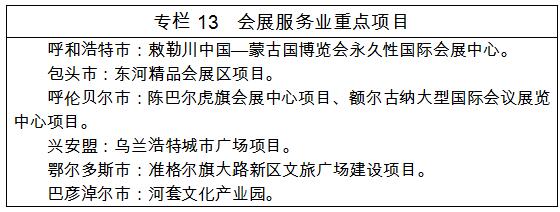 (七)會展服務(wù)業(yè)。立足資源優(yōu)勢和產(chǎn)業(yè)基礎(chǔ),以質(zhì)量提升為重點(diǎn),促進(jìn)會展業(yè)與農(nóng)牧業(yè)、制造業(yè)、服務(wù)業(yè)等融合發(fā)展,提升會展業(yè)總體水平。到2025年,年營業(yè)收入超過1000萬元會展龍頭企業(yè)超過10家,每年舉辦10場以上國際性、全國性大型論壇、會展活動,會展業(yè)直接收入超過100億元,展會拉動全區(qū)直接交易消費(fèi)超過1000億元,會展業(yè)成為推動內(nèi)蒙古經(jīng)濟(jì)發(fā)展的重點(diǎn)產(chǎn)業(yè)。