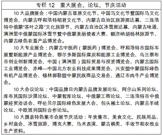 培育壯大品牌展會。實(shí)施內(nèi)蒙古品牌戰(zhàn)略,做強(qiáng)中國內(nèi)蒙古草原文化節(jié)等10大品牌展會;依托優(yōu)勢產(chǎn)業(yè)和特色文化,做精鄂爾多斯國際煤炭和能源工業(yè)博覽會等10大專業(yè)展會;依托各地區(qū)基礎(chǔ)和文化特色,做特阿爾山系列論壇等10大會議論壇。進(jìn)一步挖掘旗縣(市、區(qū))、蘇木鄉(xiāng)鎮(zhèn)地域、民族、民俗特色和生態(tài)環(huán)境優(yōu)勢,精心打造年貨集市、美食文化等10大旗縣特色集市會展節(jié)慶活動,爭取實(shí)現(xiàn)“一個旗縣一個特色展”。
