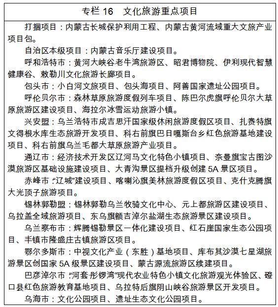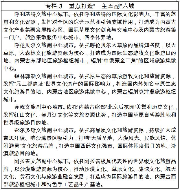 1. 不斷強(qiáng)化東中西部旅游差異化發(fā)展。積極探索全域旅游發(fā)展新模式,加快推動旅游業(yè)由“旅游+”向“+旅游”轉(zhuǎn)變,全力打造最具魅力、最有活力的國內(nèi)外知名旅游目的地。加快推動?xùn)|中西部旅游業(yè)差異化協(xié)調(diào)發(fā)展,東部地區(qū)(呼倫貝爾市、興安盟、通遼市、赤峰市、錫林郭勒盟)重點(diǎn)推進(jìn)生態(tài)旅游、邊境旅游、冰雪旅游提檔升級,打造呼倫貝爾國內(nèi)一流草原森林生態(tài)和邊境旅游目的地;中部地區(qū)(呼和浩特市、包頭市、鄂爾多斯市、烏蘭察布市)重點(diǎn)發(fā)展文化遺產(chǎn)、草原風(fēng)情、健康體育和休閑度假,打造呼和浩特現(xiàn)代休閑與會展旅游中心、鄂爾多斯文化體驗和休閑旅游目的地;西部地區(qū)(巴彥淖爾市、烏海市、阿拉善盟)推動發(fā)展特色生態(tài)旅游、沙漠休閑和自駕越野,打造阿拉善國內(nèi)知名西部風(fēng)情旅游區(qū)??缑耸写蛟齑缶皡^(qū),跨區(qū)域布設(shè)“黃金線”,建設(shè)以生態(tài)為底色、以文化為特色、以旅游為產(chǎn)業(yè)支撐的“帶—圈—線—城—郊—園”文旅融合發(fā)展格局。以自然生態(tài)、歷史文化和鄉(xiāng)村旅游為基礎(chǔ),以文化體驗和休閑旅游為創(chuàng)建主題,結(jié)合戶外運(yùn)動、科普研學(xué)等專項旅游,大力推動“生態(tài)+文化+旅游”“農(nóng)牧+文化+旅游”“康養(yǎng)+文化+旅游”“教育+文化+旅游”“體育+文化+旅游”“工業(yè)+文化+旅游”等旅游業(yè)跨界融合發(fā)展,加快構(gòu)建“壯美內(nèi)蒙古·亮麗風(fēng)景線”文化旅游發(fā)展帶。
