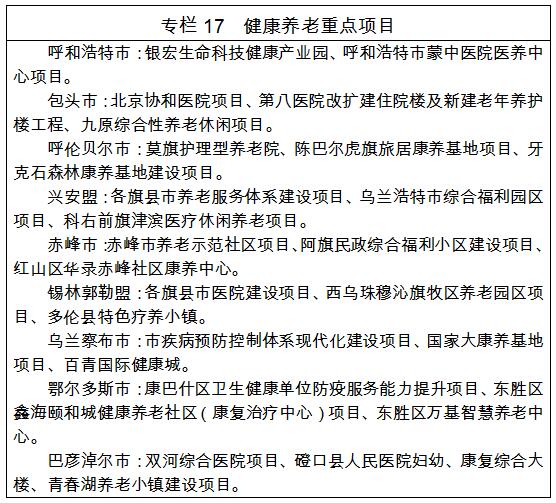(三)建設(shè)特色康養(yǎng)服務(wù)發(fā)展帶。以呼倫貝爾市、錫林郭勒盟、赤峰市、烏蘭察布市、鄂爾多斯市為重點(diǎn),統(tǒng)籌全域醫(yī)療衛(wèi)生資源空間配置,加快引導(dǎo)中心城區(qū)優(yōu)質(zhì)醫(yī)療衛(wèi)生資源向城市次中心區(qū)域及農(nóng)村牧區(qū)疏解延伸,充分整合“東部地區(qū)復(fù)合型功能拓展翼”上各康養(yǎng)資源豐富節(jié)點(diǎn)城市,共同培育發(fā)展以醫(yī)養(yǎng)結(jié)合、生態(tài)養(yǎng)生為特色的康養(yǎng)服務(wù)業(yè),打造一批以健康養(yǎng)生為核心的特色康養(yǎng)服務(wù)區(qū)和健康養(yǎng)老示范基地。依托森林、草原、沙漠等康養(yǎng)資源,打造草原休閑度假綜合體、康養(yǎng)小鎮(zhèn)等多元(泛)康養(yǎng)載體,大力構(gòu)建以健康養(yǎng)生、旅游休閑、體育運(yùn)動為核心,以現(xiàn)代農(nóng)牧業(yè)、文化創(chuàng)意等產(chǎn)業(yè)為支撐的陽光康養(yǎng)產(chǎn)業(yè)體系。堅持以旅游促康養(yǎng)、以康養(yǎng)促旅游,加快推進(jìn)文旅康融合發(fā)展,在阿爾山市、鄂托克旗、康巴什區(qū)、集寧區(qū)、察哈爾右翼中旗、敖漢旗、多倫縣、烏拉蓋、大興安嶺等地區(qū)打造一批特色溫泉、草原森林等康養(yǎng)品牌。加快建設(shè)呼倫貝爾、興安盟、通遼、赤峰、阿拉善等中醫(yī)藥(蒙醫(yī)藥)生產(chǎn)基地,打造以中醫(yī)藥(蒙醫(yī)藥)為主題的康養(yǎng)基地。建設(shè)一批特色區(qū)域性旅居“候鳥式”康養(yǎng)基地和社區(qū)康養(yǎng)中心,加快配套發(fā)展養(yǎng)老服務(wù)和醫(yī)療服務(wù)業(yè),建設(shè)智慧養(yǎng)老和醫(yī)療服務(wù)體系,滿足多層次康養(yǎng)需求。