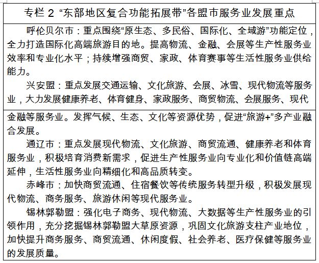 ????(二)東部地區(qū)復(fù)合型功能拓展翼。堅持規(guī)劃引領(lǐng)、功能完善、復(fù)合發(fā)展的思路,以呼和浩特市為核心,以呼包鄂烏為發(fā)展極,向呼倫貝爾市、興安盟、通遼市、赤峰市、錫林郭勒盟五盟市輻射延展,帶動?xùn)|部地區(qū)五盟市改造提升傳統(tǒng)服務(wù)業(yè),培育發(fā)展現(xiàn)代服務(wù)業(yè)。以生活性服務(wù)業(yè)為重點(diǎn),著力補(bǔ)足東部地區(qū)服務(wù)業(yè)發(fā)展短板和不足。進(jìn)一步突出服務(wù)功能完善、消費(fèi)升級導(dǎo)向和新業(yè)態(tài)新模式培育,推進(jìn)產(chǎn)業(yè)轉(zhuǎn)型升級,推動各盟市向現(xiàn)代化、復(fù)合型功能服務(wù)城市轉(zhuǎn)變。主動接受京津冀、環(huán)渤海地區(qū)輻射帶動,強(qiáng)化產(chǎn)業(yè)對接,加快推進(jìn)服務(wù)產(chǎn)品、技術(shù)、業(yè)態(tài)和模式創(chuàng)新,積極發(fā)展健康養(yǎng)老、現(xiàn)代物流、電子商務(wù)、現(xiàn)代金融等新興服務(wù)業(yè),大力發(fā)展觀光旅游、休閑度假、文化體驗為主的現(xiàn)代旅游業(yè),建設(shè)全區(qū)具有活力的服務(wù)業(yè)復(fù)合型功能拓展翼。鼓勵呼倫貝爾市、興安盟、通遼市、赤峰市、錫林郭勒盟立足自身優(yōu)勢,主動接受“一極”輻射,圍繞產(chǎn)業(yè)定位,引進(jìn)龍頭企業(yè)和高端品牌,加快特色產(chǎn)業(yè)聚集,培育形成各具特色的區(qū)域性商貿(mào)流通中心、區(qū)域性休閑度假和文化旅游中心、區(qū)域性康養(yǎng)服務(wù)中心等,構(gòu)筑服務(wù)業(yè)發(fā)展新高地。