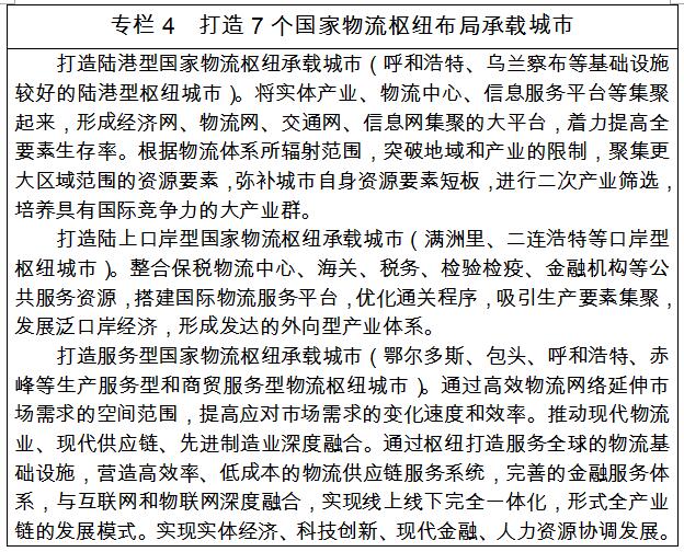 ????(二)建設(shè)現(xiàn)代物流聚集發(fā)展帶。以呼和浩特市為核心,以包頭市、呼倫貝爾市、赤峰市、錫林郭勒盟、烏蘭察布市、鄂爾多斯市等節(jié)點(diǎn)城市及邊境口岸、交通樞紐、區(qū)域中心城市和大型商品集散地為依托,推動建設(shè)一批物流平臺、區(qū)域性商貿(mào)中心和國際物流通道,加快形成一體化發(fā)展現(xiàn)代物流體系,全力打造現(xiàn)代物流集聚發(fā)展帶。統(tǒng)籌推進(jìn)呼和浩特、烏蘭察布陸港型國家物流樞紐,鄂爾多斯、包頭生產(chǎn)服務(wù)型國家物流樞紐,呼和浩特、赤峰商貿(mào)服務(wù)型國家物流樞紐,呼倫貝爾(滿洲里)、錫林郭勒(二連浩特)陸上邊境口岸型國家物流樞紐建設(shè),著力提升陸地港、綜保區(qū)、機(jī)場等口岸作業(yè)能力,拓展國內(nèi)國際物流大通道。立足自治區(qū)口岸優(yōu)勢,布局建設(shè)以7個國家物流樞紐承載城市為重點(diǎn),以旗縣(市、區(qū))物流中心為補(bǔ)充的樞紐網(wǎng)絡(luò),完善國內(nèi)、國際集疏運(yùn)體系,促進(jìn)商品和生產(chǎn)要素循環(huán),鼓勵發(fā)展多式聯(lián)運(yùn)和倉儲冷鏈物流,推動實(shí)現(xiàn)全球供應(yīng)鏈采購、國際物流以及倉儲、加工、區(qū)域配送的一體化服務(wù)運(yùn)作。加快融入國家物流大通道,不斷深化與天津港的物流通道合作。與兄弟?。▍^(qū)、市)攜手共建西部陸海新通道,加強(qiáng)與全國其他國家物流樞紐間的業(yè)務(wù)協(xié)同,進(jìn)一步暢通國內(nèi)大循環(huán)通道,為維護(hù)自治區(qū)產(chǎn)業(yè)鏈、供應(yīng)鏈穩(wěn)定提供重要支撐。構(gòu)筑我國向北開放陸海新通道,高位打造陸港型國家物流樞紐承載城市,將國家物流樞紐與中歐班列融合發(fā)展,強(qiáng)化國家物流樞紐與國外物流節(jié)點(diǎn)的戰(zhàn)略合作和業(yè)務(wù)聯(lián)系,吸引大量貨物從內(nèi)蒙古出境,有效帶動周邊地區(qū)企業(yè)向自治區(qū)聚集;打造路上口岸型國家物流樞紐承載城市,借助連接歐亞的國際貨物運(yùn)輸大通道,建成歐洲產(chǎn)品進(jìn)出口物流集散地。與天津、大連等港口聯(lián)動,建成日韓產(chǎn)品輸往俄羅斯、歐洲的聯(lián)運(yùn)通道。加快草原絲綢之路經(jīng)濟(jì)帶建設(shè),為多邊貿(mào)易組織建設(shè)、區(qū)域經(jīng)濟(jì)發(fā)展、全球價值鏈形成提供新的動力與廣闊的發(fā)展空間。