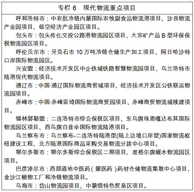 物流基礎(chǔ)設(shè)施。以提升互聯(lián)互通能力為重點(diǎn),優(yōu)化布局結(jié)構(gòu),加快國際、省際、區(qū)內(nèi)大通道建設(shè)。加快推進(jìn)綜合性運(yùn)輸樞紐建設(shè),實(shí)現(xiàn)貨運(yùn)“無縫銜接”。加快建設(shè)集大、包銀高鐵,力爭實(shí)現(xiàn)地級市高鐵全覆蓋。實(shí)施省際通道改高速工程,實(shí)現(xiàn)重要出區(qū)通道、重點(diǎn)口岸通高速公路,提標(biāo)建設(shè)沿邊公路,打造與國家主干網(wǎng)連接的快速通道。加快呼和浩特新機(jī)場建設(shè),提升樞紐機(jī)場能力。加快打造產(chǎn)業(yè)基地型和商貿(mào)服務(wù)型物流樞紐,著力提升重點(diǎn)物流園區(qū)集聚輻射功能。加快完善呼和浩特沙良公鐵物流港和呼和浩特綜合保稅區(qū)、包頭公鐵海鐵物流港、滿都拉口岸物流中心、烏蘭察布中歐班列集結(jié)中心、天津港烏蘭察布內(nèi)陸港、鄂爾多斯綜合保稅區(qū)和空港物流園區(qū)、巴彥淖爾農(nóng)畜產(chǎn)品冷鏈物流中心、甘其毛都公路鐵路物流園區(qū)、烏海蒙古煤生產(chǎn)加工基地和烏海國際陸港建設(shè),打造國內(nèi)外物流大通道。加快推進(jìn)物流信息基礎(chǔ)設(shè)施建設(shè),為實(shí)現(xiàn)“公共平臺”基礎(chǔ)交換功能創(chuàng)造條件。強(qiáng)化物流園區(qū)、危險品運(yùn)輸、多式聯(lián)運(yùn)、甩掛運(yùn)輸、物流企業(yè)聯(lián)盟互聯(lián)互通。推進(jìn)部門間信息互聯(lián)共享,拓展平臺應(yīng)用領(lǐng)域,完善標(biāo)準(zhǔn)、安全、集成應(yīng)用等物流服務(wù)功能。